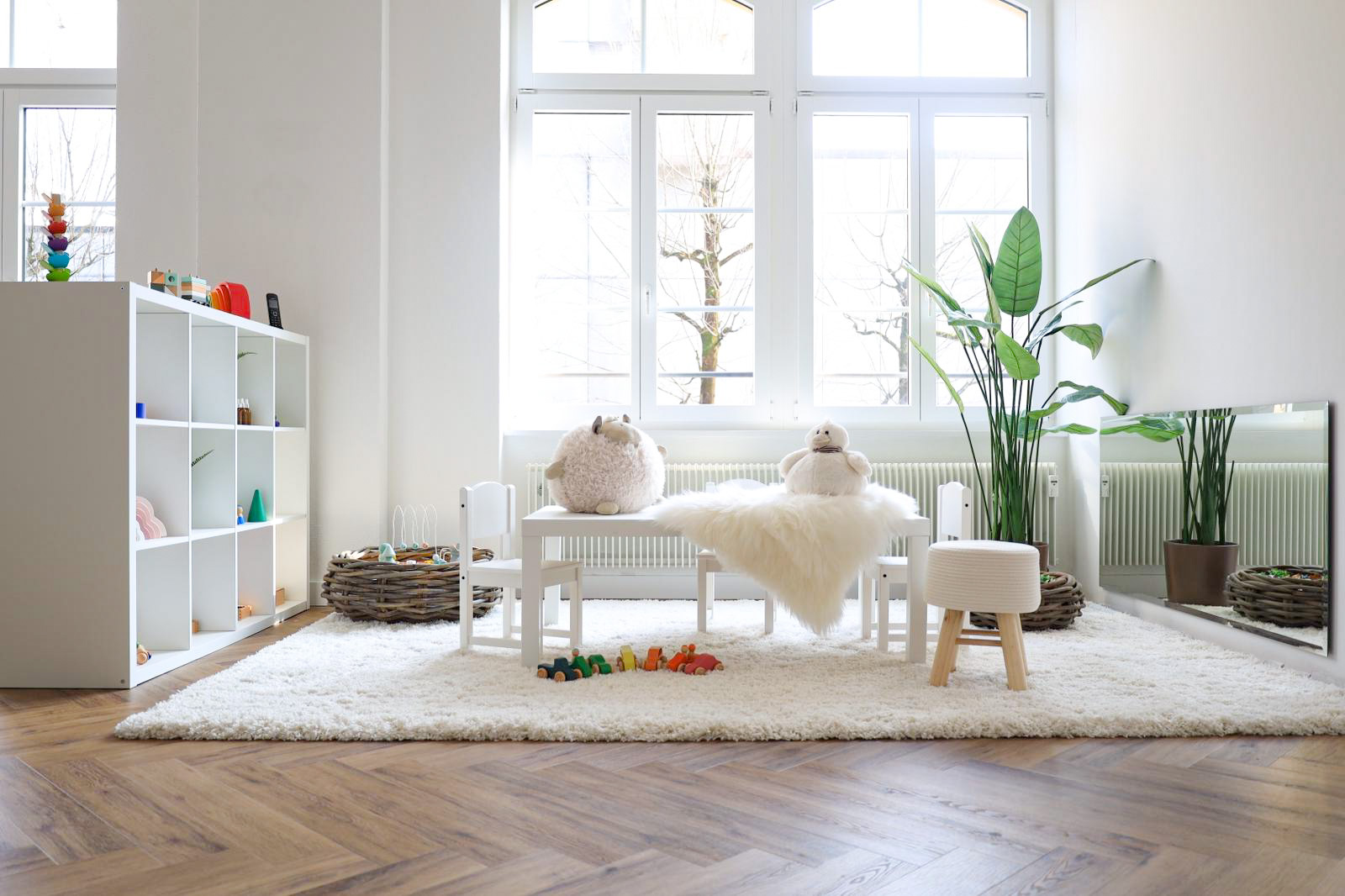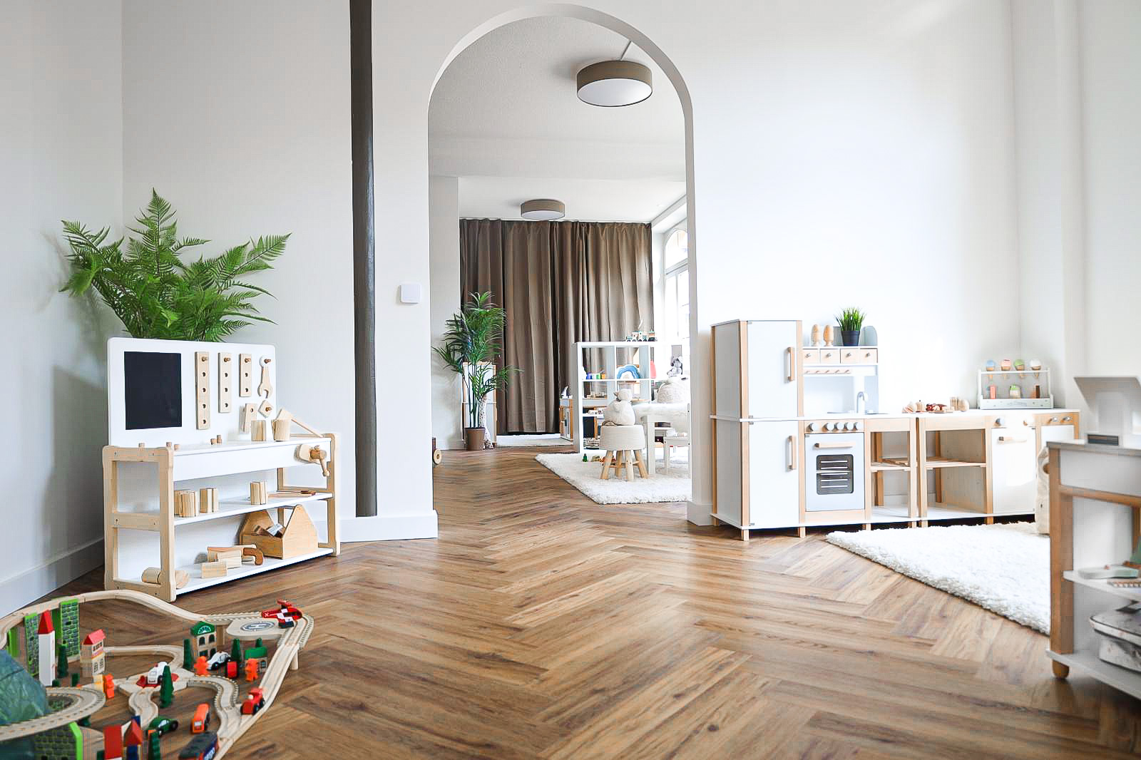 Mit viel Liebe haben wir jeden einzelnen Raum unserer Kita eingerichtet. Unser Ziel war es, räumlich eine heimelige, „cozy“ Atmosphäre und Umgebung zu schaffen, wo sich die Kinder wohlfühlen können. Als Basis wählten wir bewusst „ruhige“ Farben um visuelle Reizüberflutungen zu vermeiden. Die farbigen Spielsachen ergeben mit der ruhigen Basis ein harmonisches Gesamtbild.